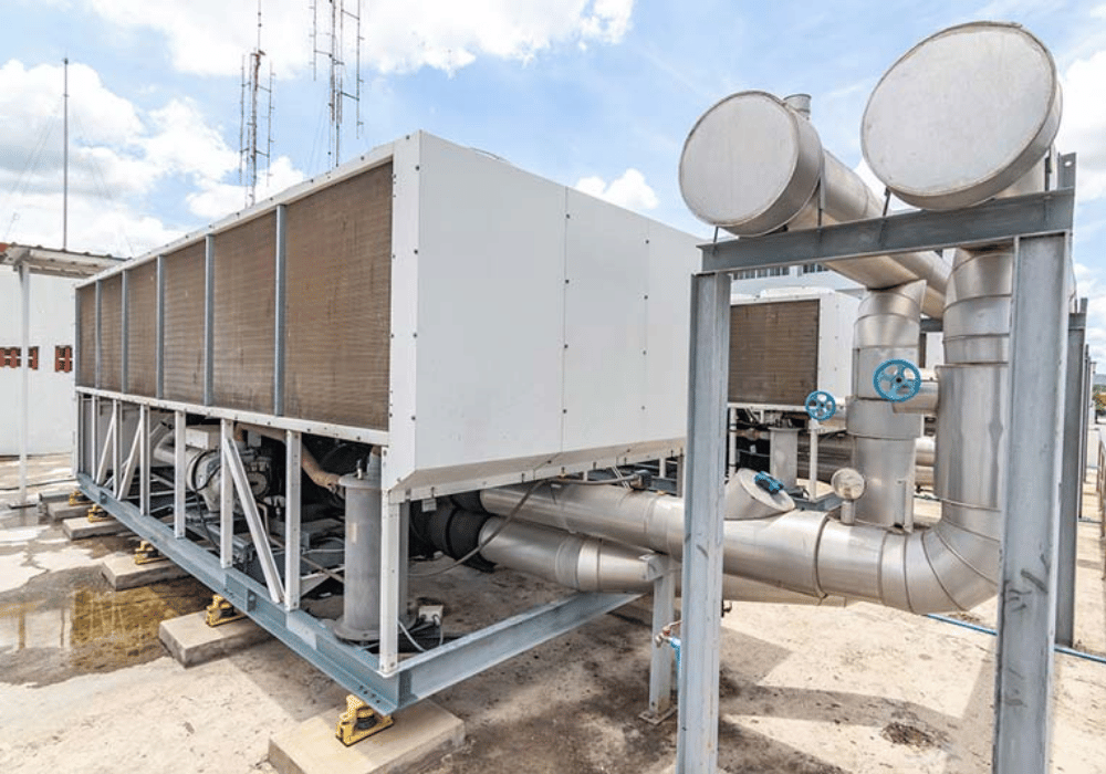 A commercial chiller system is a specialized HVAC system designed to cool large spaces, such as office buildings, factories, and commercial establishments. It uses refrigerant to absorb heat from the air and cool the environment.